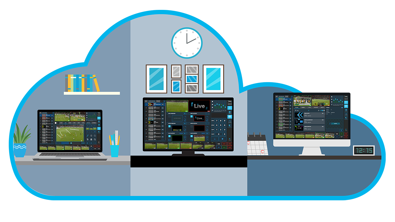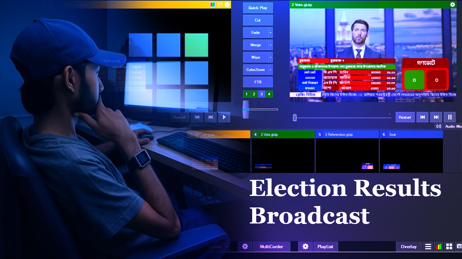 Virtual studio scenes with multi-camera views and graphic overlays, ready to use instantly.